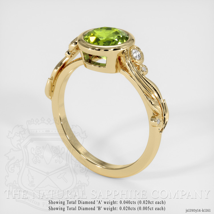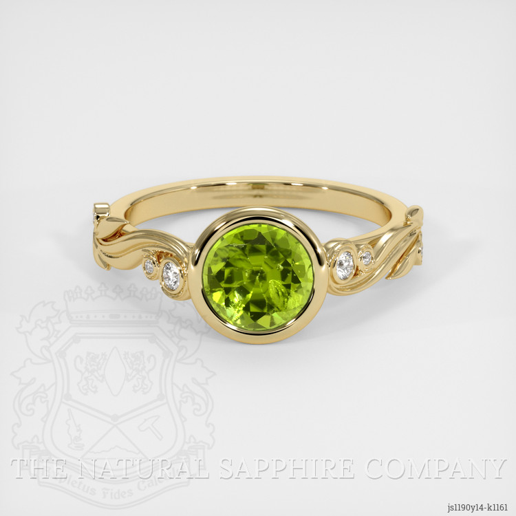 The ring features a beautiful, transparent 1.31 carat round shape green peridot with the dimensions of 6.95 x 7.06 x 4.48 mm and a mixed brilliant cut. It has a clarity grade of slightly included (evaluated at eye level), intense color saturation, and an excellent polish. The origin of this peridot is Pakistan.