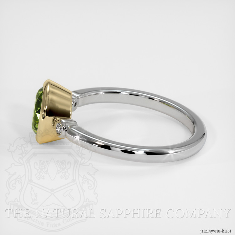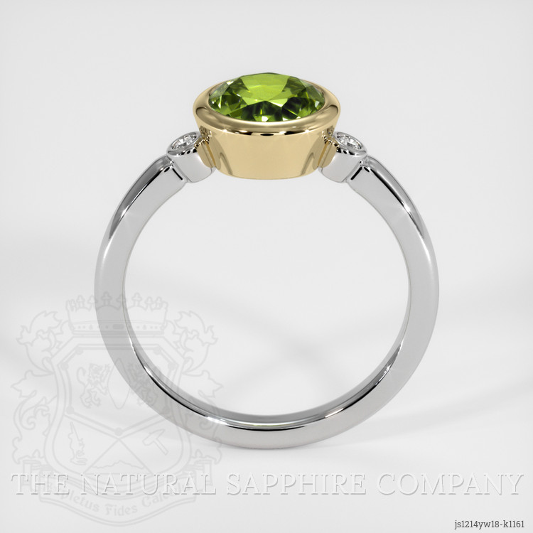 The ring features a beautiful, transparent 1.31 carat round shape green peridot with the dimensions of 6.95 x 7.06 x 4.48 mm and a mixed brilliant cut. It has a clarity grade of slightly included (evaluated at eye level), intense color saturation, and an excellent polish. The origin of this peridot is Pakistan.