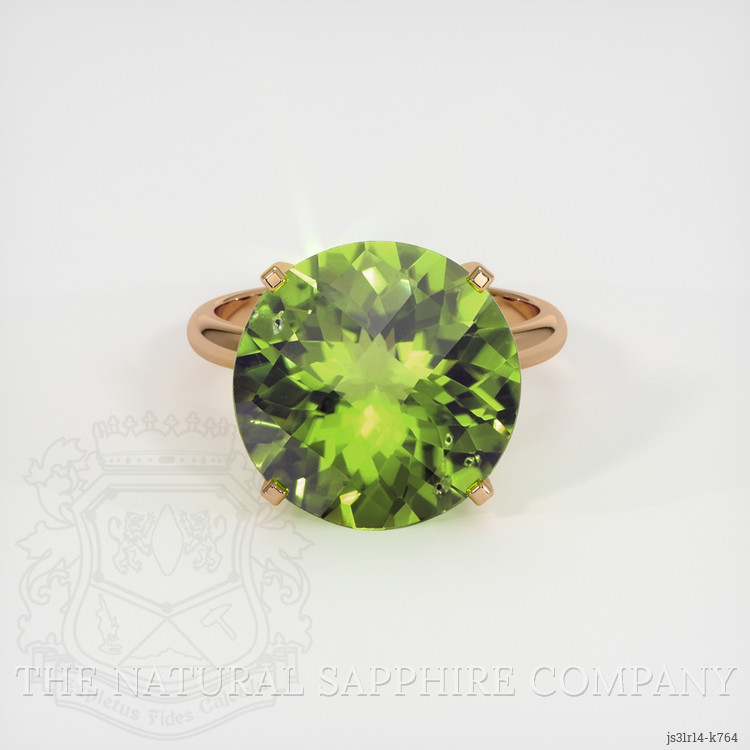 The ring features a beautiful, transparent 8.62 carat round shape green peridot with the dimensions of 14.12 x 14.00 x 7.47 mm and a checkerboard cut. It has a clarity grade of very slightly included (evaluated at eye level), intense color saturation, and an excellent polish. The origin of this peridot is Pakistan.