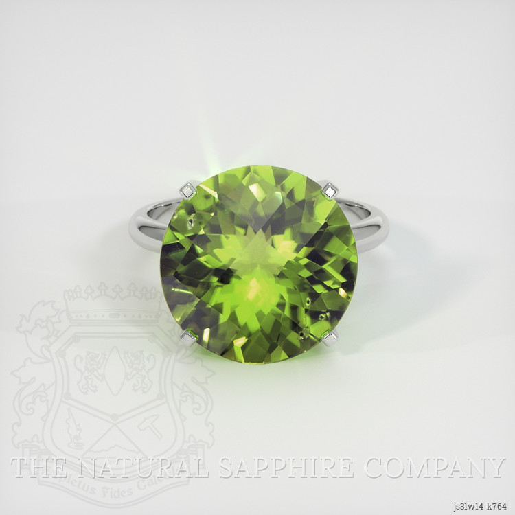The ring features a beautiful, transparent 8.62 carat round shape green peridot with the dimensions of 14.12 x 14.00 x 7.47 mm and a checkerboard cut. It has a clarity grade of very slightly included (evaluated at eye level), intense color saturation, and an excellent polish. The origin of this peridot is Pakistan.