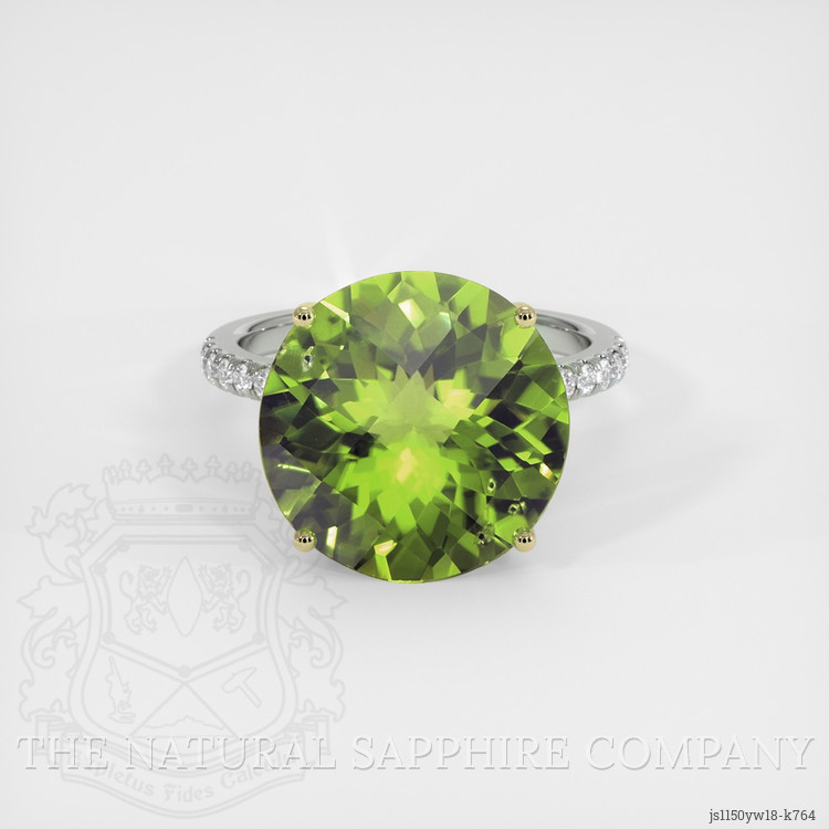 The ring features a beautiful, transparent 8.62 carat round shape green peridot with the dimensions of 14.12 x 14.00 x 7.47 mm and a checkerboard cut. It has a clarity grade of very slightly included (evaluated at eye level), intense color saturation, and an excellent polish. The origin of this peridot is Pakistan.