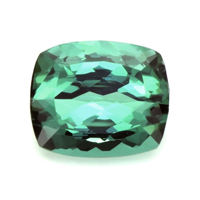 The men's ring features a beautiful, transparent 1.58 carat cushion shape green tourmaline with the dimensions of 7.63 x 6.45 x 4.02 mm and a mixed brilliant cut. It has a clarity grade of eye clean (evaluated at eye level), intense color saturation, and an excellent polish. The origin of this tourmaline is Namibia.