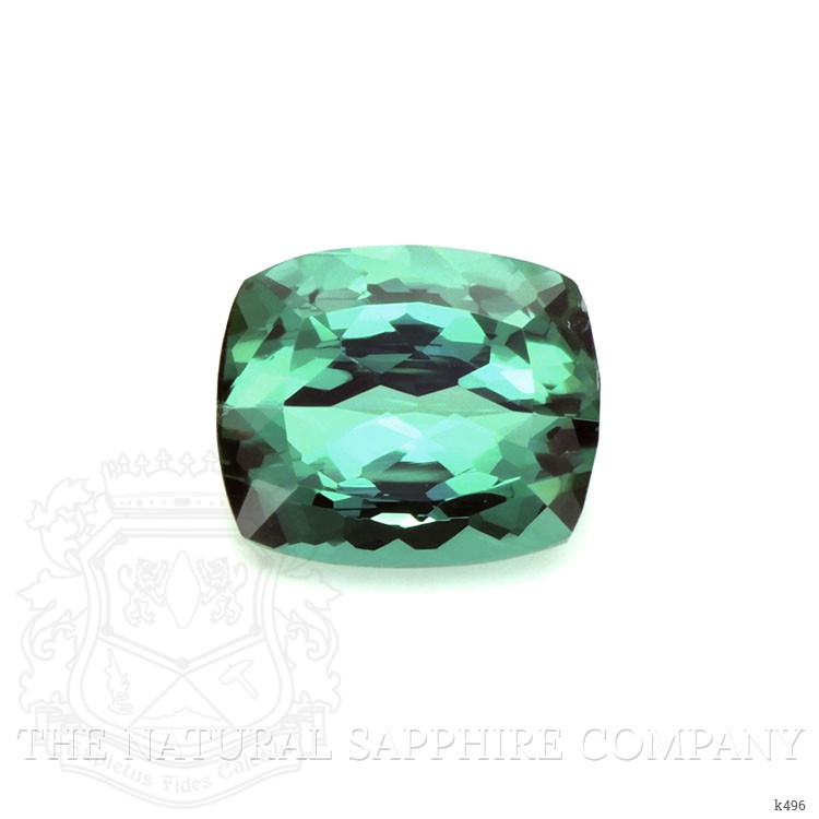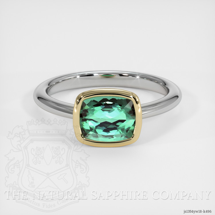 The men's ring features a beautiful, transparent 1.58 carat cushion shape green tourmaline with the dimensions of 7.63 x 6.45 x 4.02 mm and a mixed brilliant cut. It has a clarity grade of eye clean (evaluated at eye level), intense color saturation, and an excellent polish. The origin of this tourmaline is Namibia.