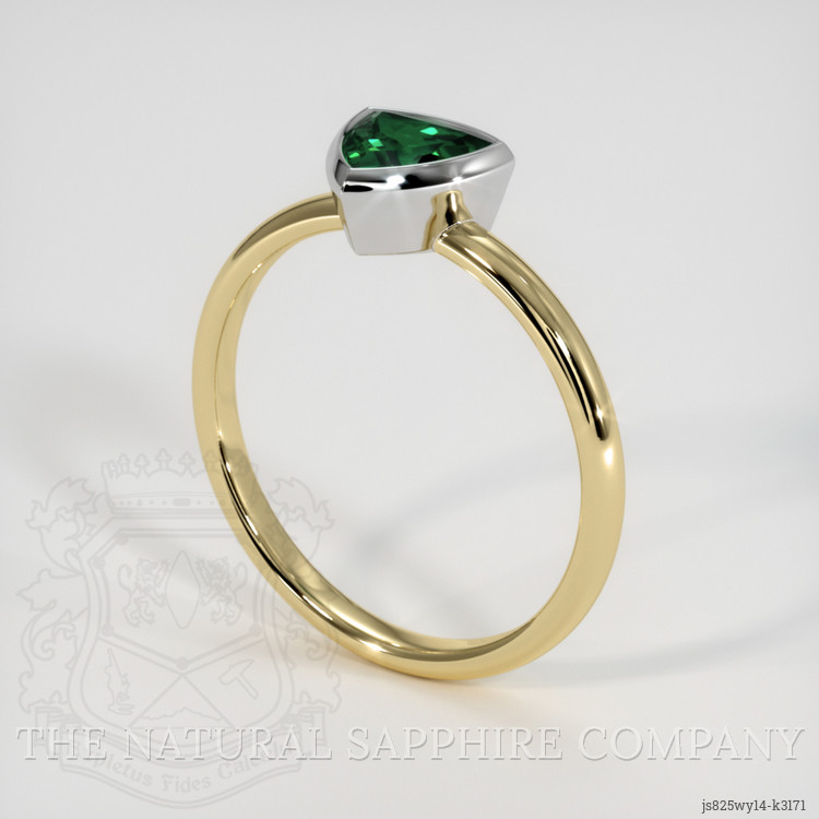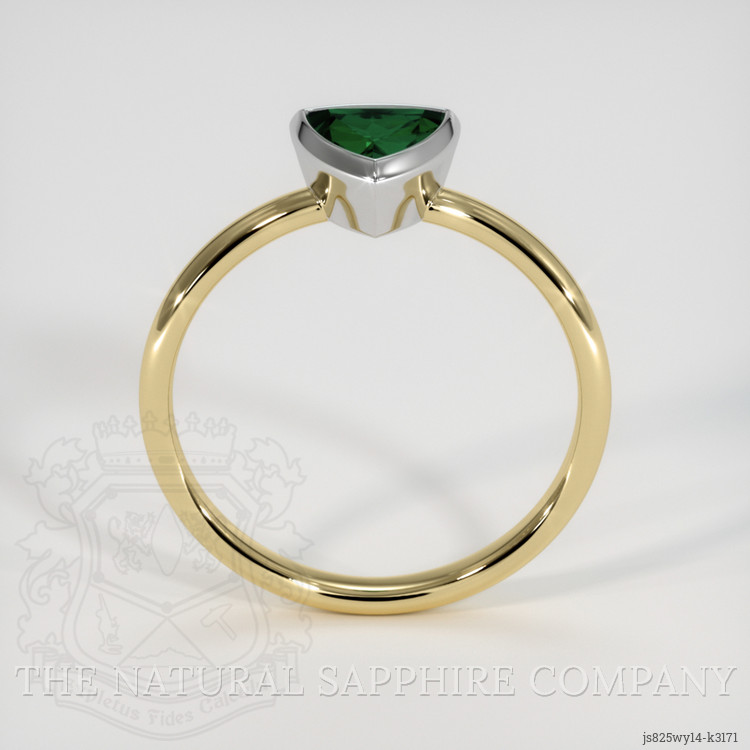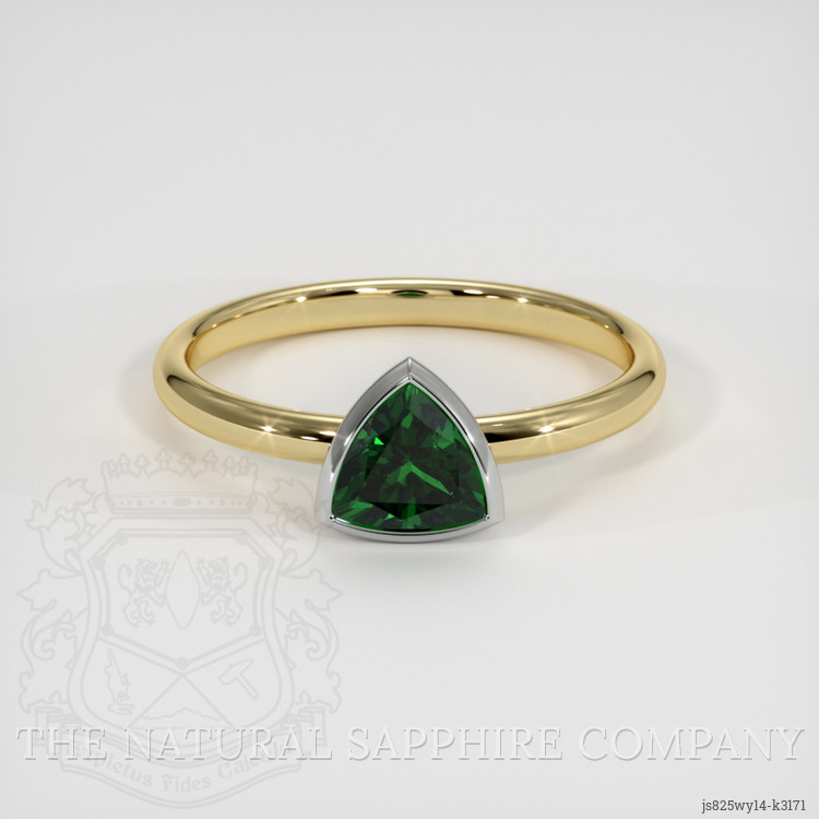 The men's ring features a beautiful, transparent 0.82 carat trillion shape green tsavoritegarnet with the dimensions of 5.93 x 6.00 x 3.85 mm and a trillion cut. It has a clarity grade of very slightly included (evaluated at eye level), vivid color saturation, and an excellent polish. The origin of this tsavoritegarnet is Tanzania.
