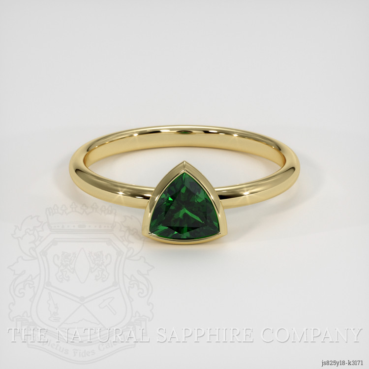 The men's ring features a beautiful, transparent 0.82 carat trillion shape green tsavoritegarnet with the dimensions of 5.93 x 6.00 x 3.85 mm and a trillion cut. It has a clarity grade of very slightly included (evaluated at eye level), vivid color saturation, and an excellent polish. The origin of this tsavoritegarnet is Tanzania.