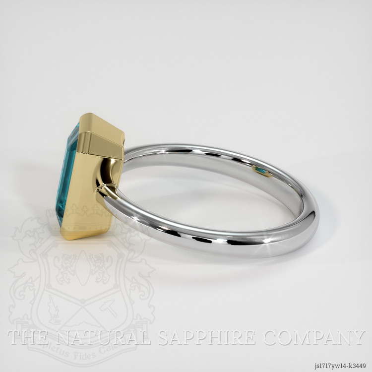 The men's ring features a beautiful, transparent 2.11 carat emerald cut shape greenish blue tourmaline with the dimensions of 9.29 x 5.87 x 4.67 mm and a emerald cut. It has a clarity grade of very slightly included (evaluated at eye level), intense color saturation, and an excellent polish. The origin of this tourmaline is Brazil.