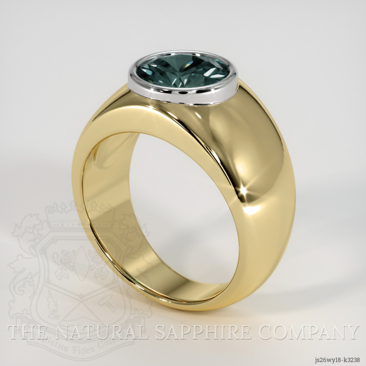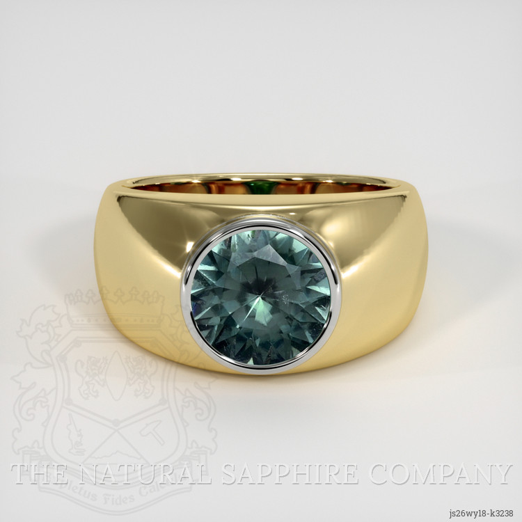 The men's ring features a beautiful, transparent 1.72 carat round shape greenish blue tourmaline with the dimensions of 8.40 x 8.53 x 4.73 mm and a mixed brilliant cut. It has a clarity grade of very slightly included (evaluated at eye level), intense color saturation, and an excellent polish. The origin of this tourmaline is Brazil.