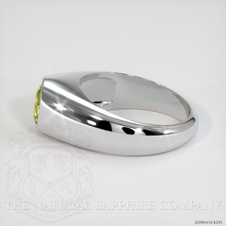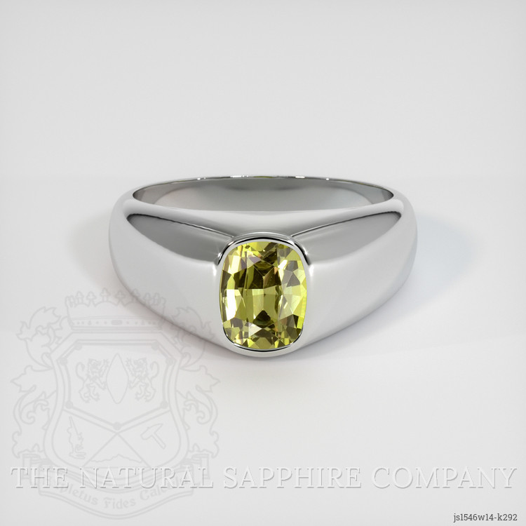 The men's ring features a beautiful, transparent 1.45 carat cushion shape greenish yellow chrysoberyl with the dimensions of 7.25 x 5.53 x 4.31 mm and a mixed brilliant cut. It has a clarity grade of very slightly included (evaluated at eye level), intense color saturation, and an excellent polish. The origin of this chrysoberyl is Ceylon (Sri Lanka).