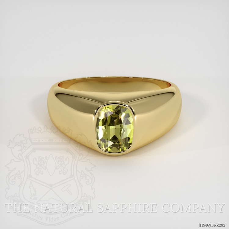 The men's ring features a beautiful, transparent 1.45 carat cushion shape greenish yellow chrysoberyl with the dimensions of 7.25 x 5.53 x 4.31 mm and a mixed brilliant cut. It has a clarity grade of very slightly included (evaluated at eye level), intense color saturation, and an excellent polish. The origin of this chrysoberyl is Ceylon (Sri Lanka).