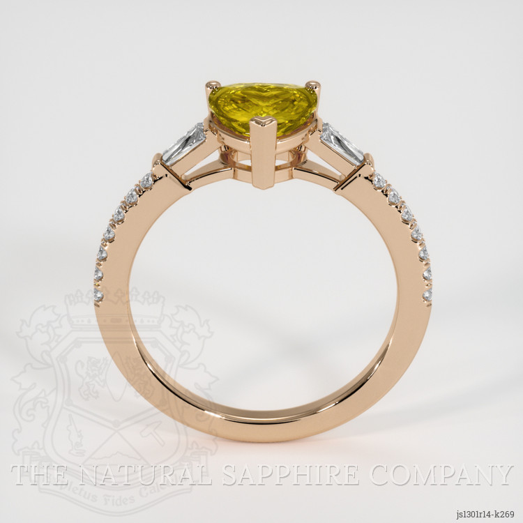 The ring features a beautiful, transparent 1.25 carat heart shape greenish yellow chrysoberyl with the dimensions of 6.89 x 6.68 x 3.92 mm and a mixed brilliant cut. It has a clarity grade of very slightly included (evaluated at eye level), intense color saturation, and an excellent polish. The origin of this chrysoberyl is Ceylon (Sri Lanka).