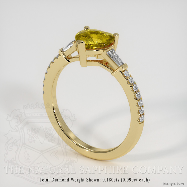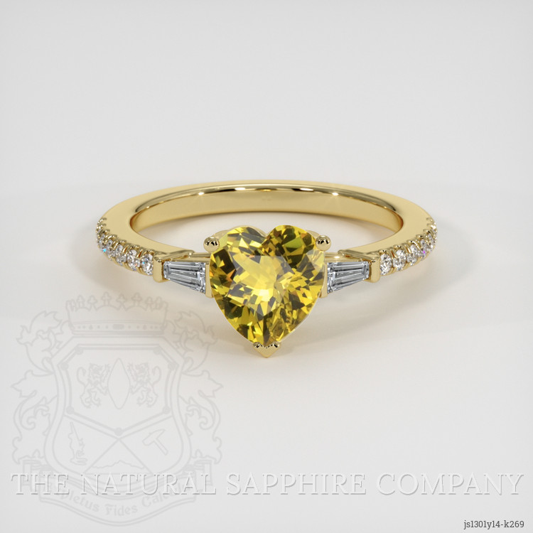 The ring features a beautiful, transparent 1.25 carat heart shape greenish yellow chrysoberyl with the dimensions of 6.89 x 6.68 x 3.92 mm and a mixed brilliant cut. It has a clarity grade of very slightly included (evaluated at eye level), intense color saturation, and an excellent polish. The origin of this chrysoberyl is Ceylon (Sri Lanka).