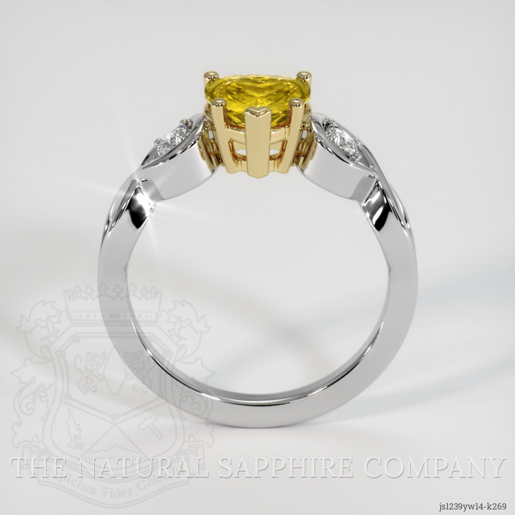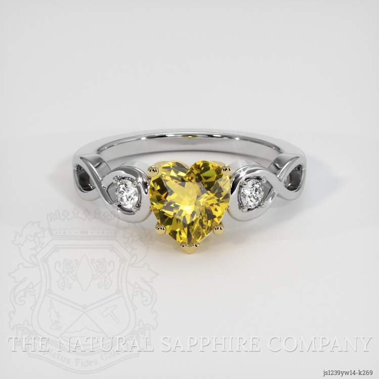 The ring features a beautiful, transparent 1.25 carat heart shape greenish yellow chrysoberyl with the dimensions of 6.89 x 6.68 x 3.92 mm and a mixed brilliant cut. It has a clarity grade of very slightly included (evaluated at eye level), intense color saturation, and an excellent polish. The origin of this chrysoberyl is Ceylon (Sri Lanka).