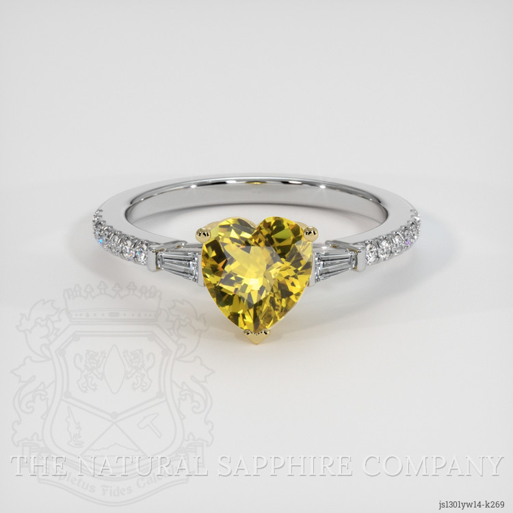 The ring features a beautiful, transparent 1.25 carat heart shape greenish yellow chrysoberyl with the dimensions of 6.89 x 6.68 x 3.92 mm and a mixed brilliant cut. It has a clarity grade of very slightly included (evaluated at eye level), intense color saturation, and an excellent polish. The origin of this chrysoberyl is Ceylon (Sri Lanka).
