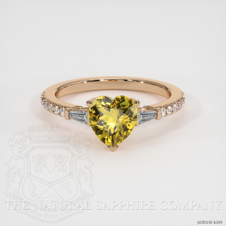 The ring features a beautiful, transparent 1.25 carat heart shape greenish yellow chrysoberyl with the dimensions of 6.89 x 6.68 x 3.92 mm and a mixed brilliant cut. It has a clarity grade of very slightly included (evaluated at eye level), intense color saturation, and an excellent polish. The origin of this chrysoberyl is Ceylon (Sri Lanka).