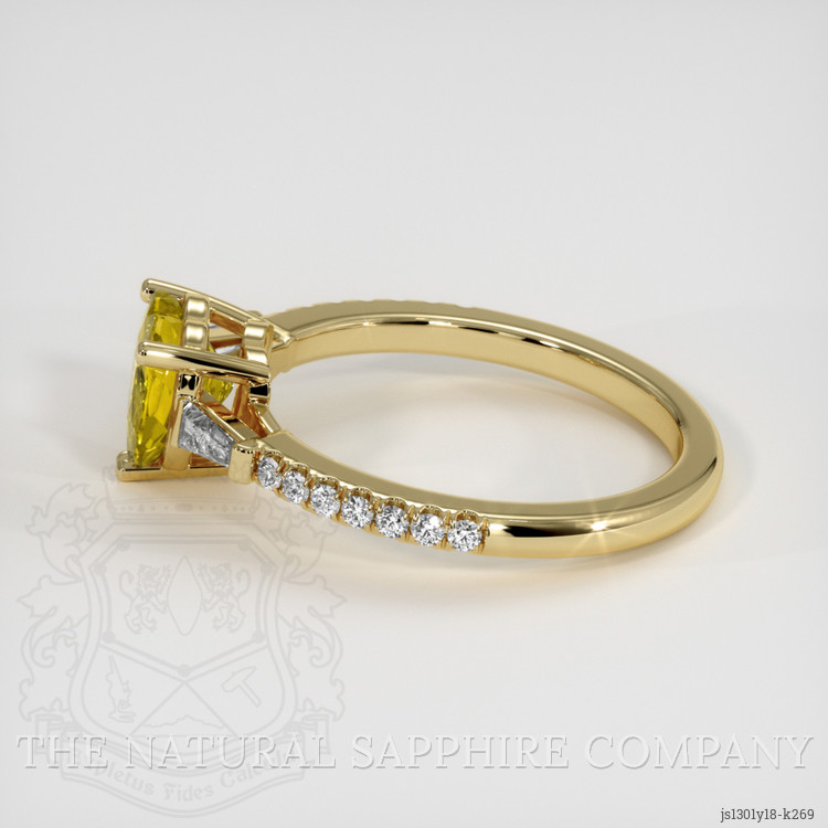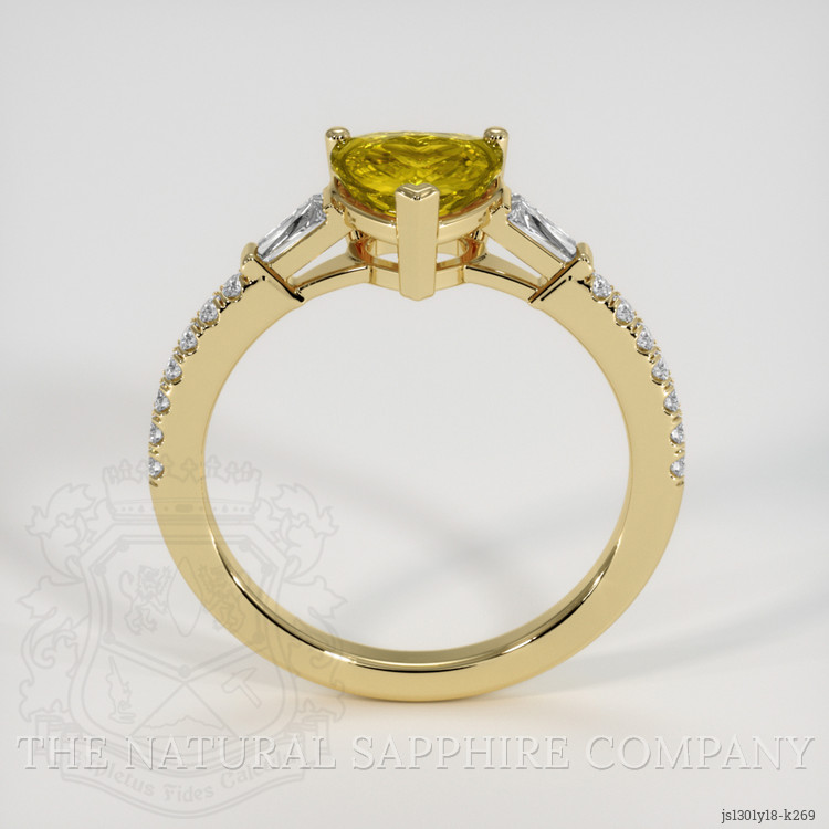 The ring features a beautiful, transparent 1.25 carat heart shape greenish yellow chrysoberyl with the dimensions of 6.89 x 6.68 x 3.92 mm and a mixed brilliant cut. It has a clarity grade of very slightly included (evaluated at eye level), intense color saturation, and an excellent polish. The origin of this chrysoberyl is Ceylon (Sri Lanka).