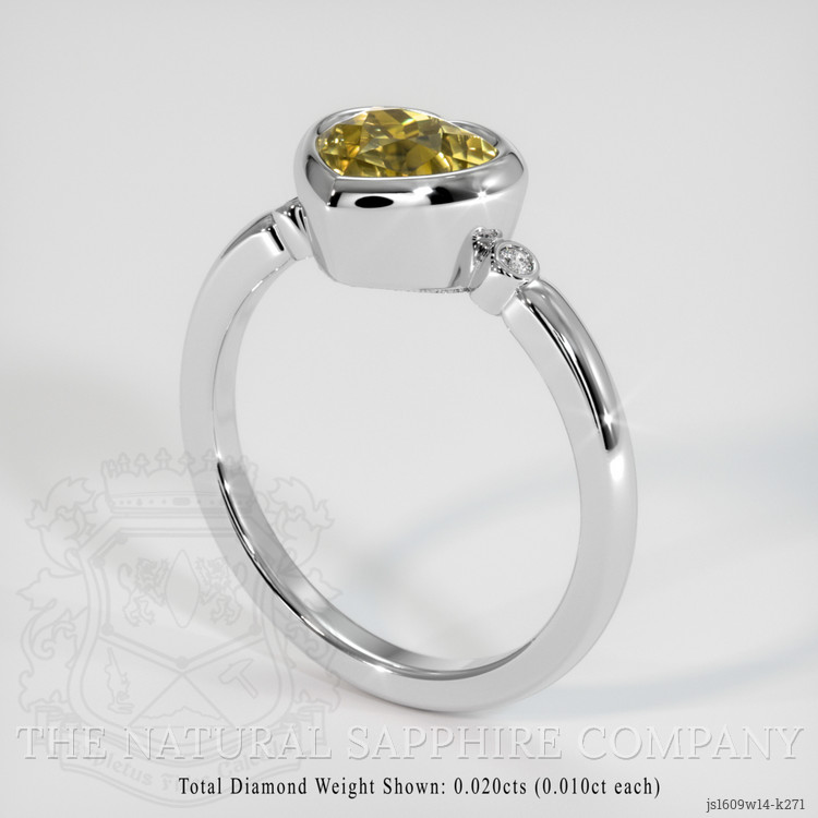 The ring features a beautiful, transparent 1.66 carat heart shape greenish yellow chrysoberyl with the dimensions of 6.75 x 7.09 x 4.91 mm and a mixed brilliant cut. It has a clarity grade of very slightly included (evaluated at eye level), medium intense color saturation, and an excellent polish. The origin of this chrysoberyl is Ceylon (Sri Lanka).