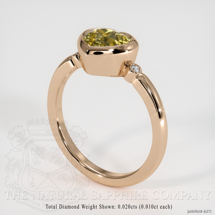 The ring features a beautiful, transparent 1.66 carat heart shape greenish yellow chrysoberyl with the dimensions of 6.75 x 7.09 x 4.91 mm and a mixed brilliant cut. It has a clarity grade of very slightly included (evaluated at eye level), medium intense color saturation, and an excellent polish. The origin of this chrysoberyl is Ceylon (Sri Lanka).