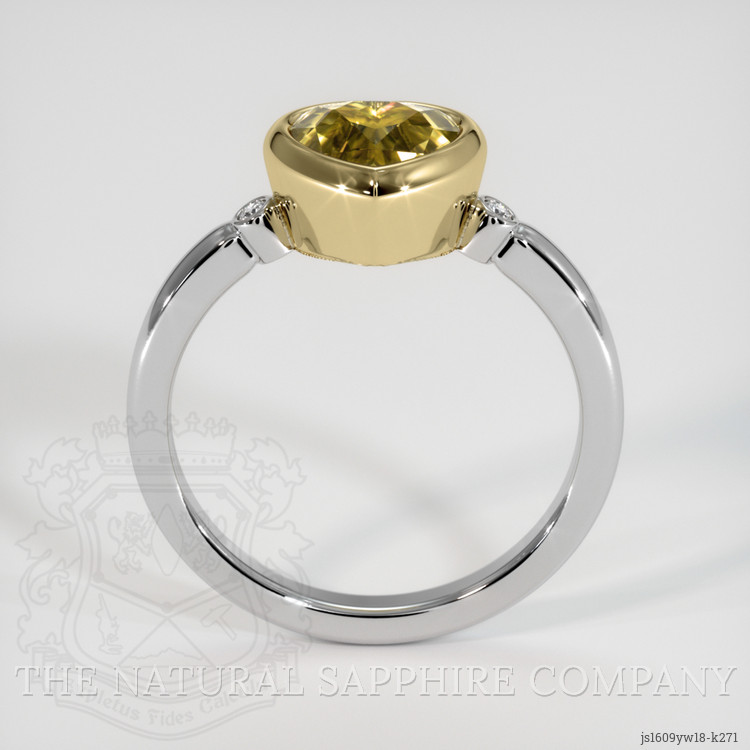The ring features a beautiful, transparent 1.66 carat heart shape greenish yellow chrysoberyl with the dimensions of 6.75 x 7.09 x 4.91 mm and a mixed brilliant cut. It has a clarity grade of very slightly included (evaluated at eye level), medium intense color saturation, and an excellent polish. The origin of this chrysoberyl is Ceylon (Sri Lanka).