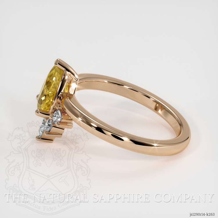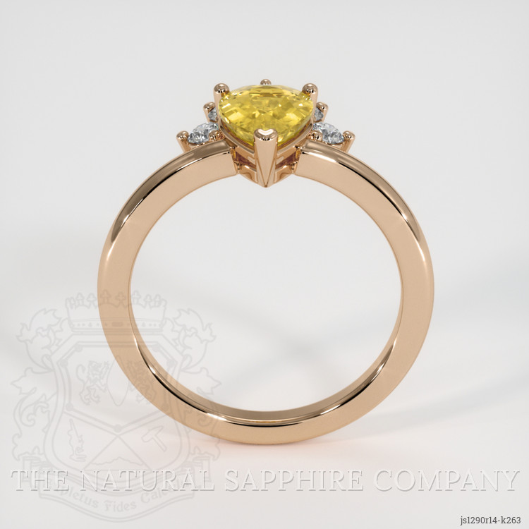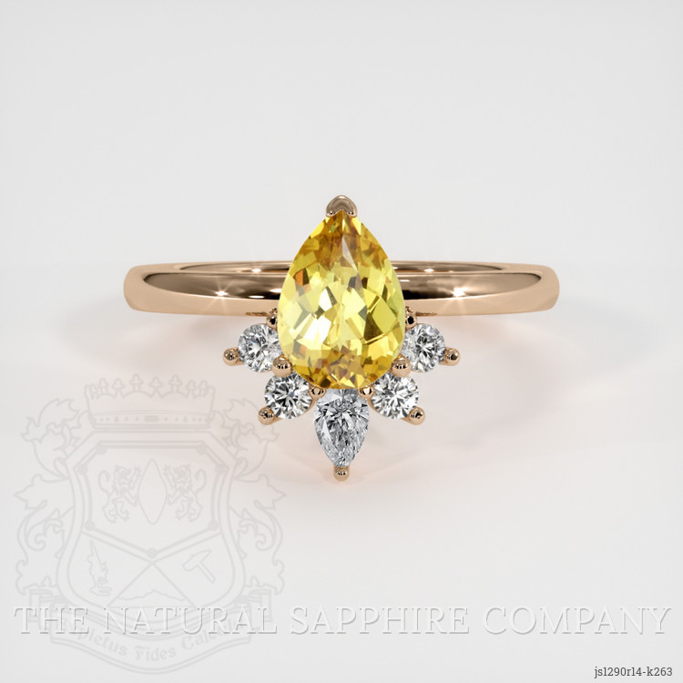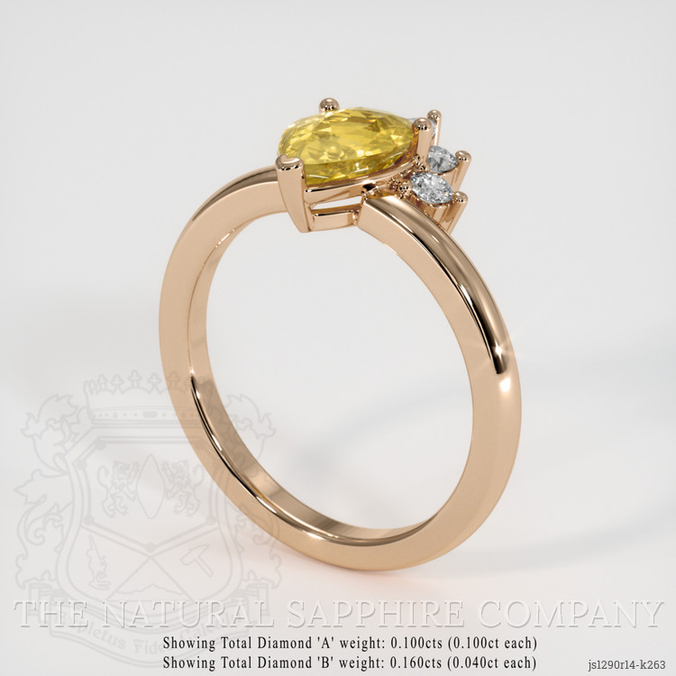 The ring features a beautiful, transparent 1.27 carat pear shape greenish yellow chrysoberyl with the dimensions of 8.30 x 5.77 x 3.71 mm and a mixed brilliant cut. It has a clarity grade of very slightly included (evaluated at eye level), intense color saturation, and an excellent polish. The origin of this chrysoberyl is Ceylon (Sri Lanka).