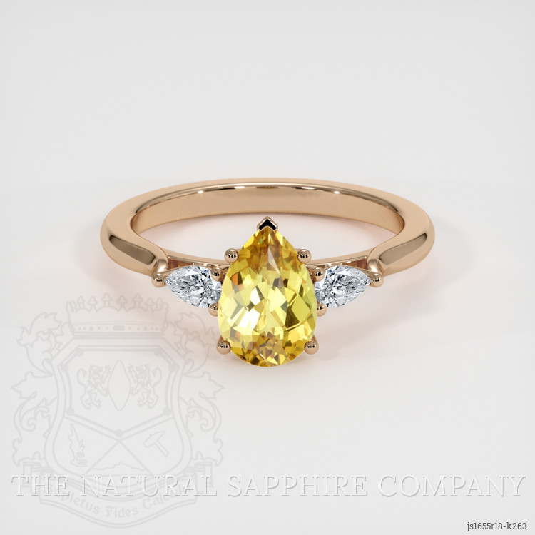 The ring features a beautiful, transparent 1.27 carat pear shape greenish yellow chrysoberyl with the dimensions of 8.30 x 5.77 x 3.71 mm and a mixed brilliant cut. It has a clarity grade of very slightly included (evaluated at eye level), intense color saturation, and an excellent polish. The origin of this chrysoberyl is Ceylon (Sri Lanka).