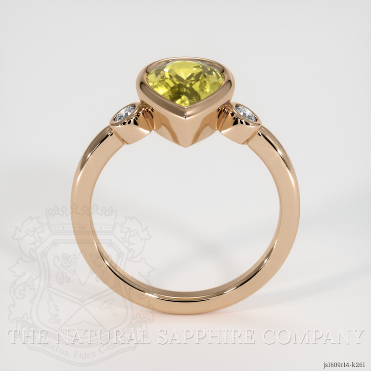 The ring features a beautiful, transparent 2.57 carat pear shape greenish yellow chrysoberyl with the dimensions of 11.16 x 7.17 x 4.50 mm and a mixed brilliant cut. It has a clarity grade of very slightly included (evaluated at eye level), medium intense color saturation, and an excellent polish. The origin of this chrysoberyl is Ceylon (Sri Lanka).