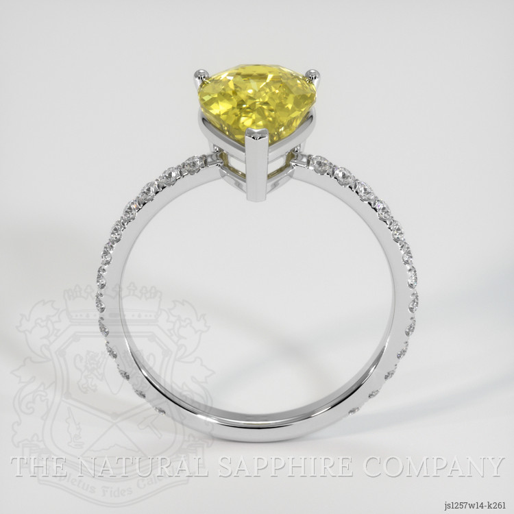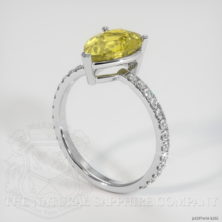 The ring features a beautiful, transparent 2.57 carat pear shape greenish yellow chrysoberyl with the dimensions of 11.16 x 7.17 x 4.50 mm and a mixed brilliant cut. It has a clarity grade of very slightly included (evaluated at eye level), medium intense color saturation, and an excellent polish. The origin of this chrysoberyl is Ceylon (Sri Lanka).
