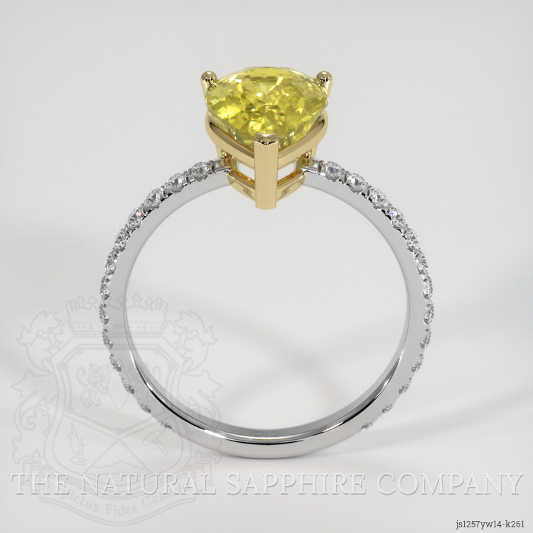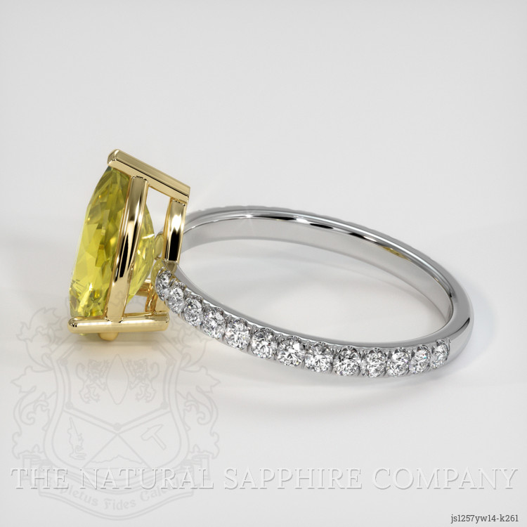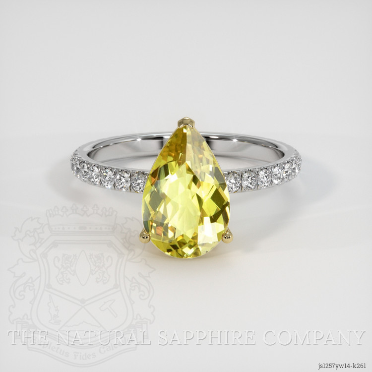 The ring features a beautiful, transparent 2.57 carat pear shape greenish yellow chrysoberyl with the dimensions of 11.16 x 7.17 x 4.50 mm and a mixed brilliant cut. It has a clarity grade of very slightly included (evaluated at eye level), medium intense color saturation, and an excellent polish. The origin of this chrysoberyl is Ceylon (Sri Lanka).
