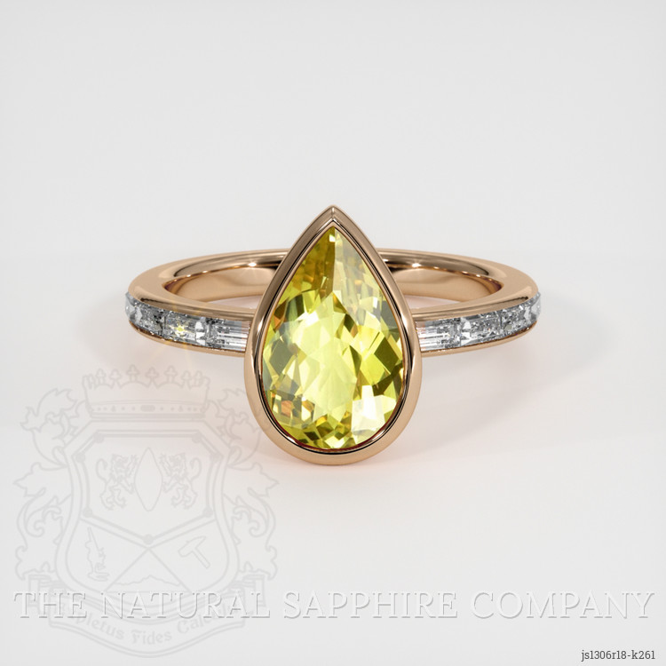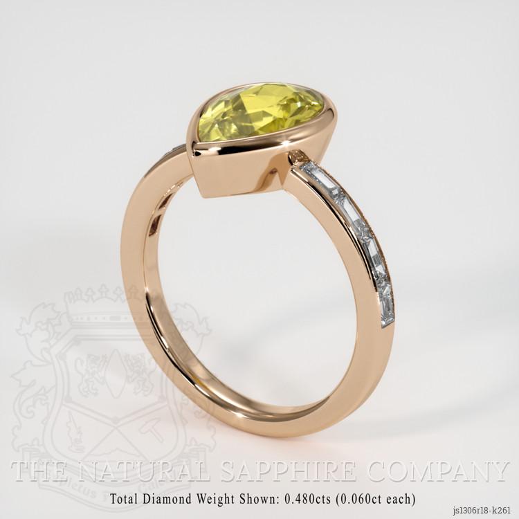 The ring features a beautiful, transparent 2.57 carat pear shape greenish yellow chrysoberyl with the dimensions of 11.16 x 7.17 x 4.50 mm and a mixed brilliant cut. It has a clarity grade of very slightly included (evaluated at eye level), medium intense color saturation, and an excellent polish. The origin of this chrysoberyl is Ceylon (Sri Lanka).