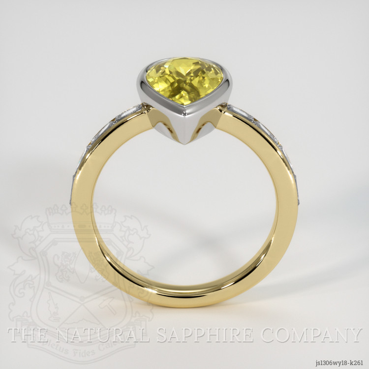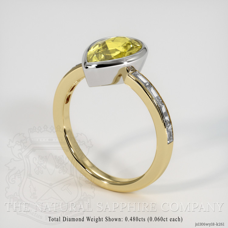 The ring features a beautiful, transparent 2.57 carat pear shape greenish yellow chrysoberyl with the dimensions of 11.16 x 7.17 x 4.50 mm and a mixed brilliant cut. It has a clarity grade of very slightly included (evaluated at eye level), medium intense color saturation, and an excellent polish. The origin of this chrysoberyl is Ceylon (Sri Lanka).