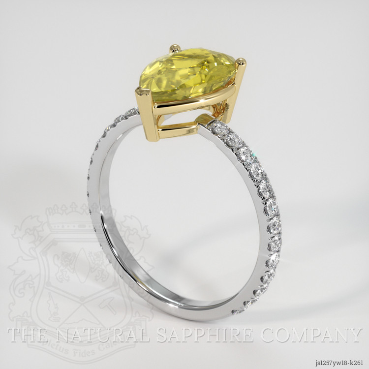 The ring features a beautiful, transparent 2.57 carat pear shape greenish yellow chrysoberyl with the dimensions of 11.16 x 7.17 x 4.50 mm and a mixed brilliant cut. It has a clarity grade of very slightly included (evaluated at eye level), medium intense color saturation, and an excellent polish. The origin of this chrysoberyl is Ceylon (Sri Lanka).