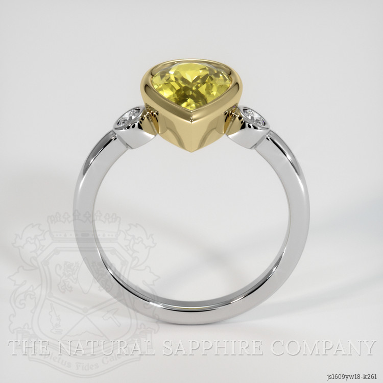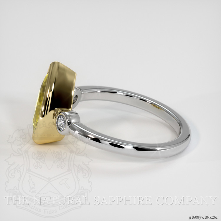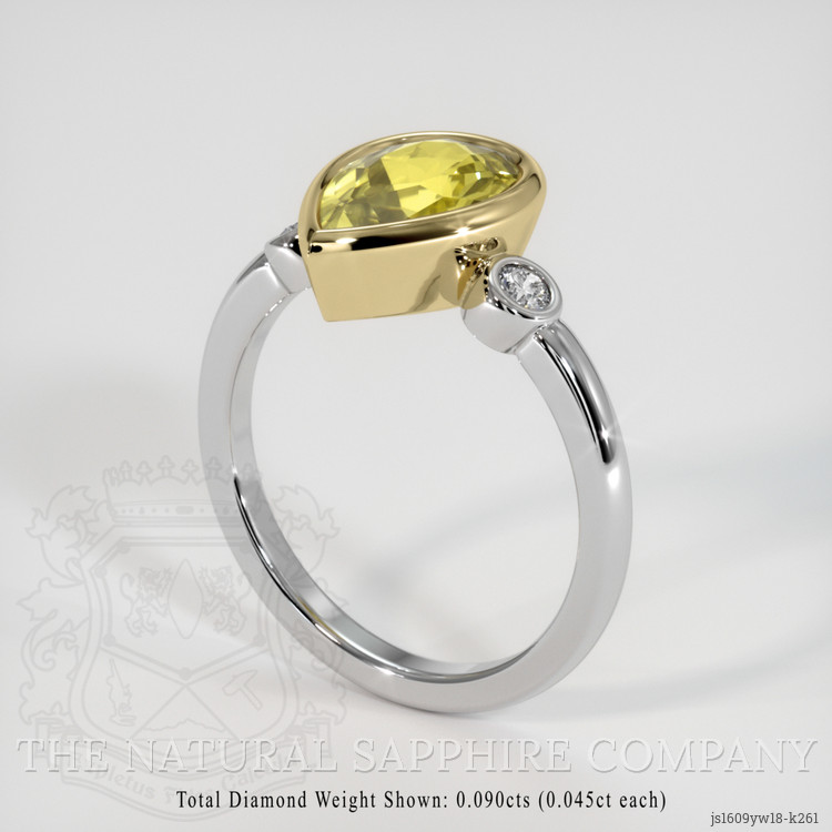 The ring features a beautiful, transparent 2.57 carat pear shape greenish yellow chrysoberyl with the dimensions of 11.16 x 7.17 x 4.50 mm and a mixed brilliant cut. It has a clarity grade of very slightly included (evaluated at eye level), medium intense color saturation, and an excellent polish. The origin of this chrysoberyl is Ceylon (Sri Lanka).