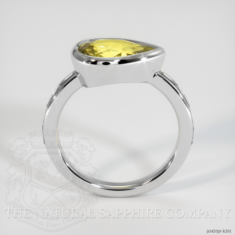 The ring features a beautiful, transparent 2.57 carat pear shape greenish yellow chrysoberyl with the dimensions of 11.16 x 7.17 x 4.50 mm and a mixed brilliant cut. It has a clarity grade of very slightly included (evaluated at eye level), medium intense color saturation, and an excellent polish. The origin of this chrysoberyl is Ceylon (Sri Lanka).