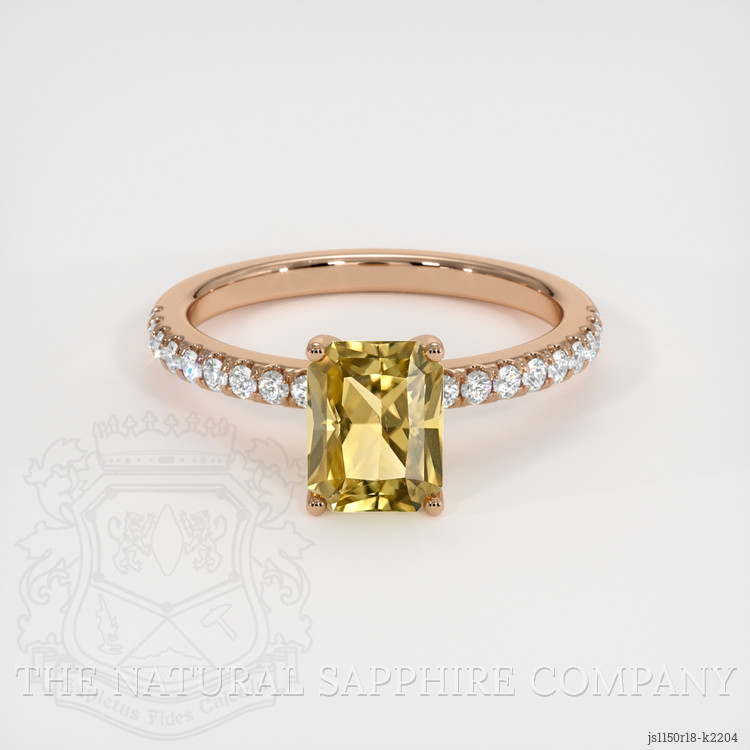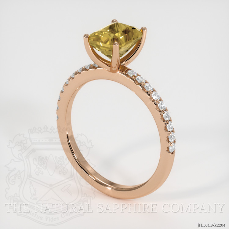 The ring features a beautiful, transparent 1.77 carat radiant shape greenish yellow chrysoberyl with the dimensions of 7.37 x 5.80 x 4.90 mm and a radiant cut. It has a clarity grade of very slightly included (evaluated at eye level), intense color saturation, and an excellent polish. The origin of this chrysoberyl is Ceylon (Sri Lanka).