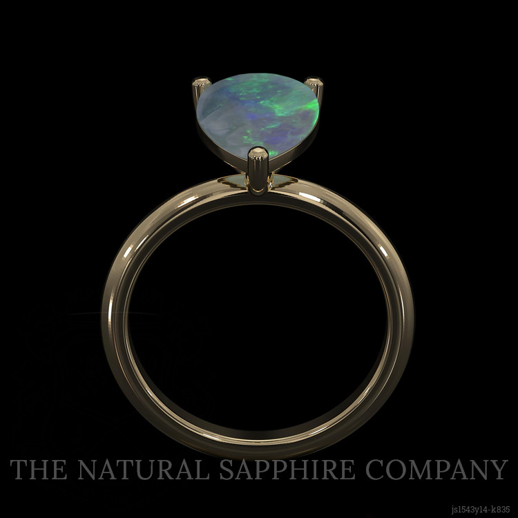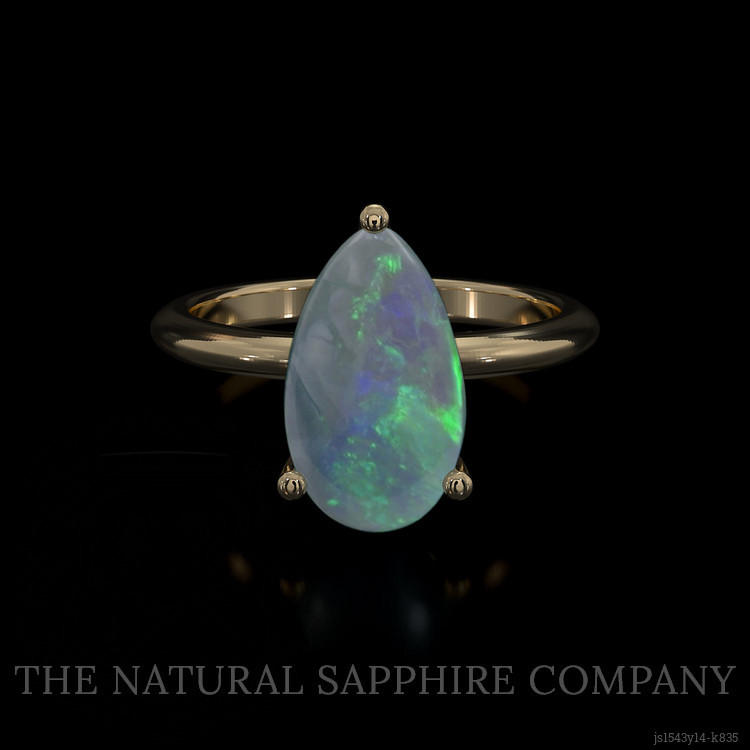 The ring features a beautiful, translucent 1.35 carat pear shape multi color opal with the dimensions of 13.29 x 7.73 x 2.22 mm and a cabochon cut. It has a clarity grade of very slightly included (evaluated at eye level), intense color saturation, and an excellent polish. The origin of this opal is Australia.