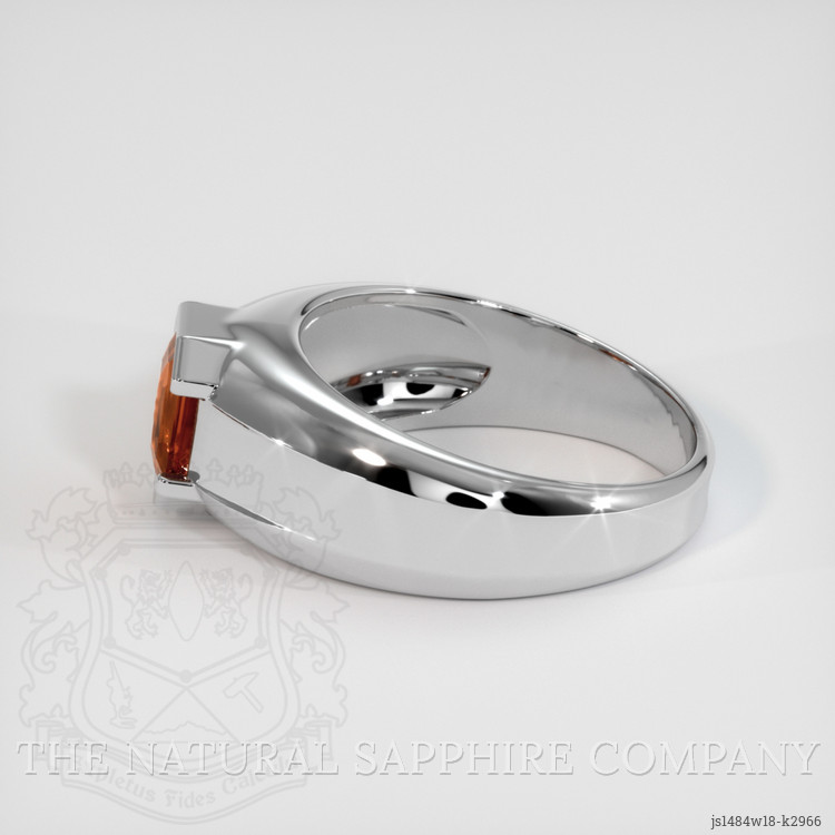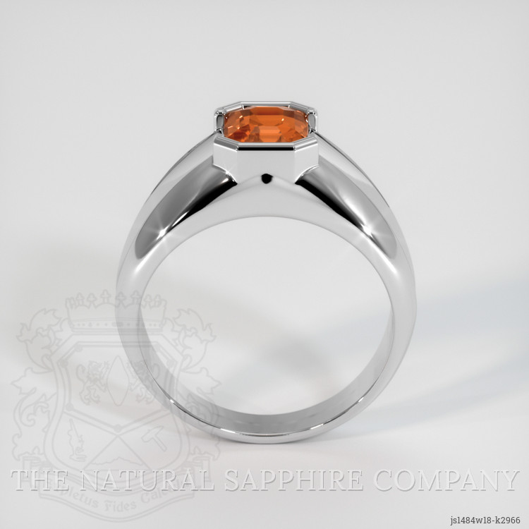 The men's ring features a beautiful, transparent 1.45 carat emerald cut shape orange garnet with the dimensions of 6.76 x 5.48 x 4.44 mm and a emerald cut. It has a clarity grade of very slightly included (evaluated at eye level), intense color saturation, and an excellent polish. The origin of this garnet is Ceylon (Sri Lanka).