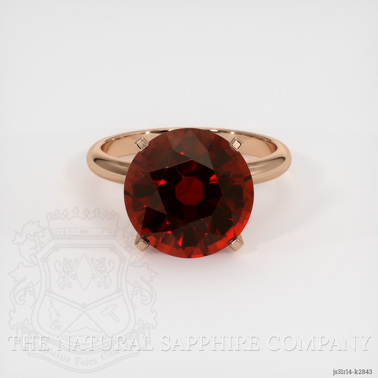 The ring features a beautiful, transparent GIA certified Orangy Red 8.50 carat round shape orangish red spessartitegarnet with the dimensions of 11.82 x 11.72 x 7.81 mm and a mixed brilliant cut. It has a clarity grade of eye clean (evaluated at eye level), vivid color saturation, and an excellent polish. The origin of this spessartitegarnet is Madagascar.