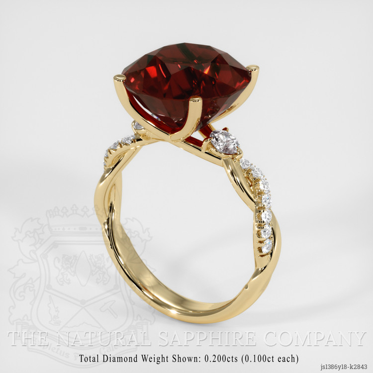 The ring features a beautiful, transparent GIA certified Orangy Red 8.50 carat round shape orangish red spessartitegarnet with the dimensions of 11.82 x 11.72 x 7.81 mm and a mixed brilliant cut. It has a clarity grade of eye clean (evaluated at eye level), vivid color saturation, and an excellent polish. The origin of this spessartitegarnet is Madagascar.