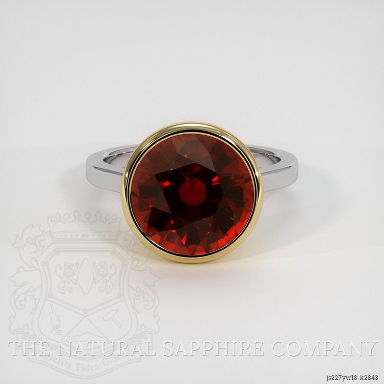 The men's ring features a beautiful, transparent GIA certified Orangy Red 8.50 carat round shape orangish red spessartitegarnet with the dimensions of 11.82 x 11.72 x 7.81 mm and a mixed brilliant cut. It has a clarity grade of eye clean (evaluated at eye level), vivid color saturation, and an excellent polish. The origin of this spessartitegarnet is Madagascar.