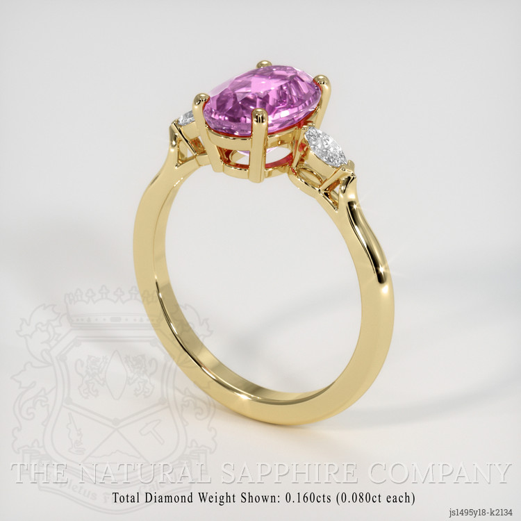 The ring features a beautiful, transparent 2.16 carat oval shape pink kunzite with the dimensions of 9.07 x 6.45 x 5.26 mm and a mixed brilliant cut. It has a clarity grade of very slightly included (evaluated at eye level), medium color saturation, and an excellent polish. The origin of this kunzite is Afghanistan.