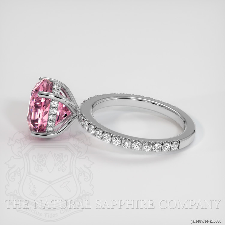 This ring centers a transparent 6.38 carat oval pink malayagarnet, cut to an oval outline with mixed brilliant faceting that measures 11.21 x 9.09 x 8.05 mm, and presents with intense color saturation and an eye clean clarity grade when evaluated at eye level. The stone displays a vivid, evenly distributed pink tone that retains depth across the face up view, and the mixed brilliant cut has been executed to balance brilliance and color return. The polish is excellent, delivering crisp facet junctions and clean reflections, and the gemstone is natural with no enhancements. The malayagarnet originates from Madagascar, and its combination of size, hue, and transparency makes it an exceptional example of this material in a wearable format.