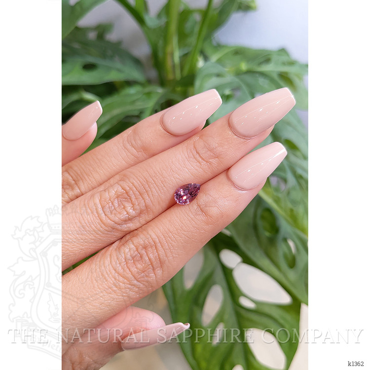 The ring features a beautiful, transparent 1.24 carat pear shape pink spinel with the dimensions of 8.35 x 5.31 x 4.19 mm and a mixed brilliant cut. It has a clarity grade of very slightly included (evaluated at eye level), medium intense color saturation, and an excellent polish. The origin of this spinel is Tanzania.