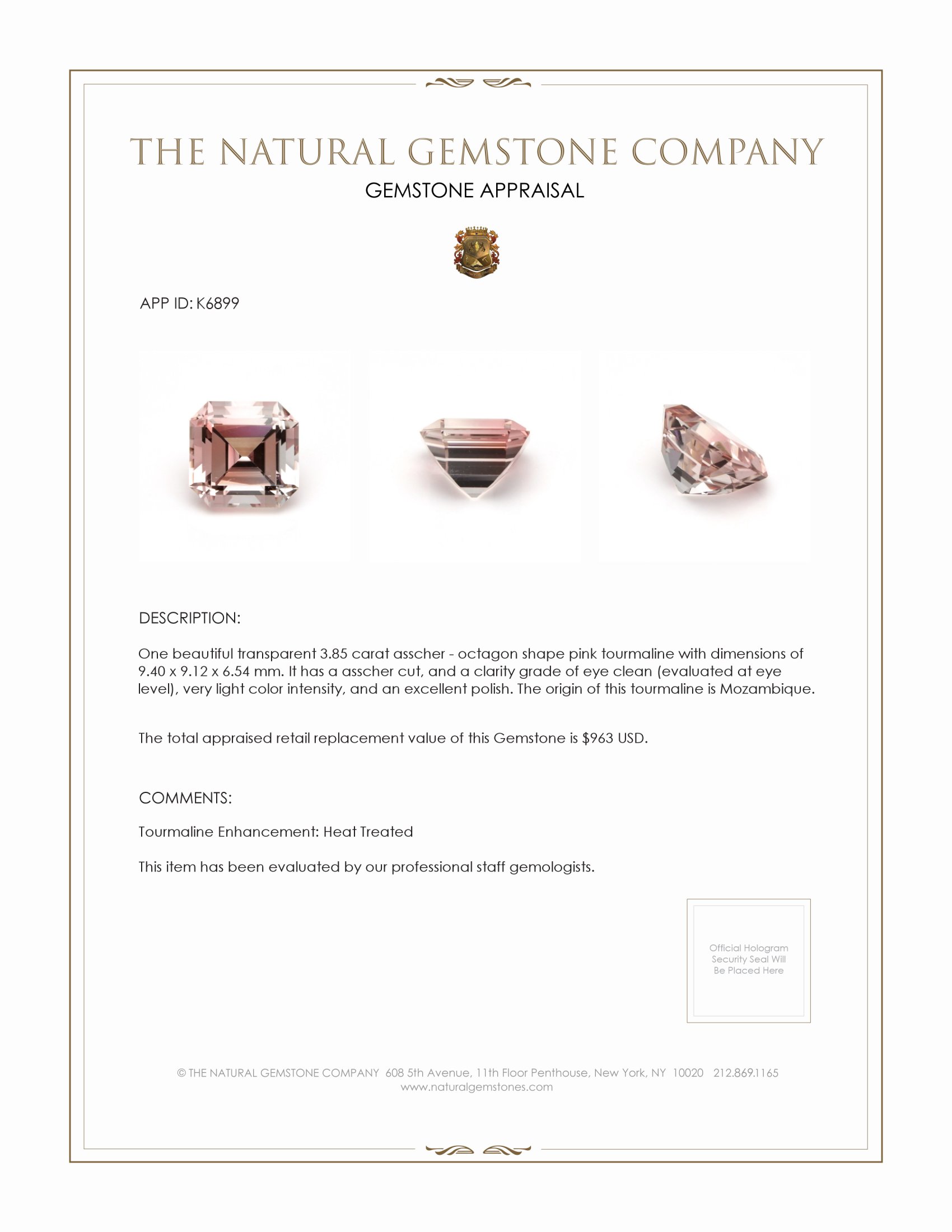 The men's ring features a stunning transparent 3.85-carat Asscher-octagon shape pink tourmaline with precise dimensions of 9.40 x 9.12 x 6.54 mm and a pristine Asscher cut. The clarity grade is eye-clean, a testament to the high-quality gemstone, and it exhibits a very light color saturation, indicative of its delicate yet impactful hue. The stone's excellent polish enhances its brilliance and reflectivity, while its origin is proudly noted as Mozambique, a region renowned for producing exquisite tourmalines with remarkable natural beauty.
