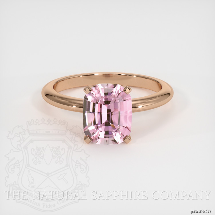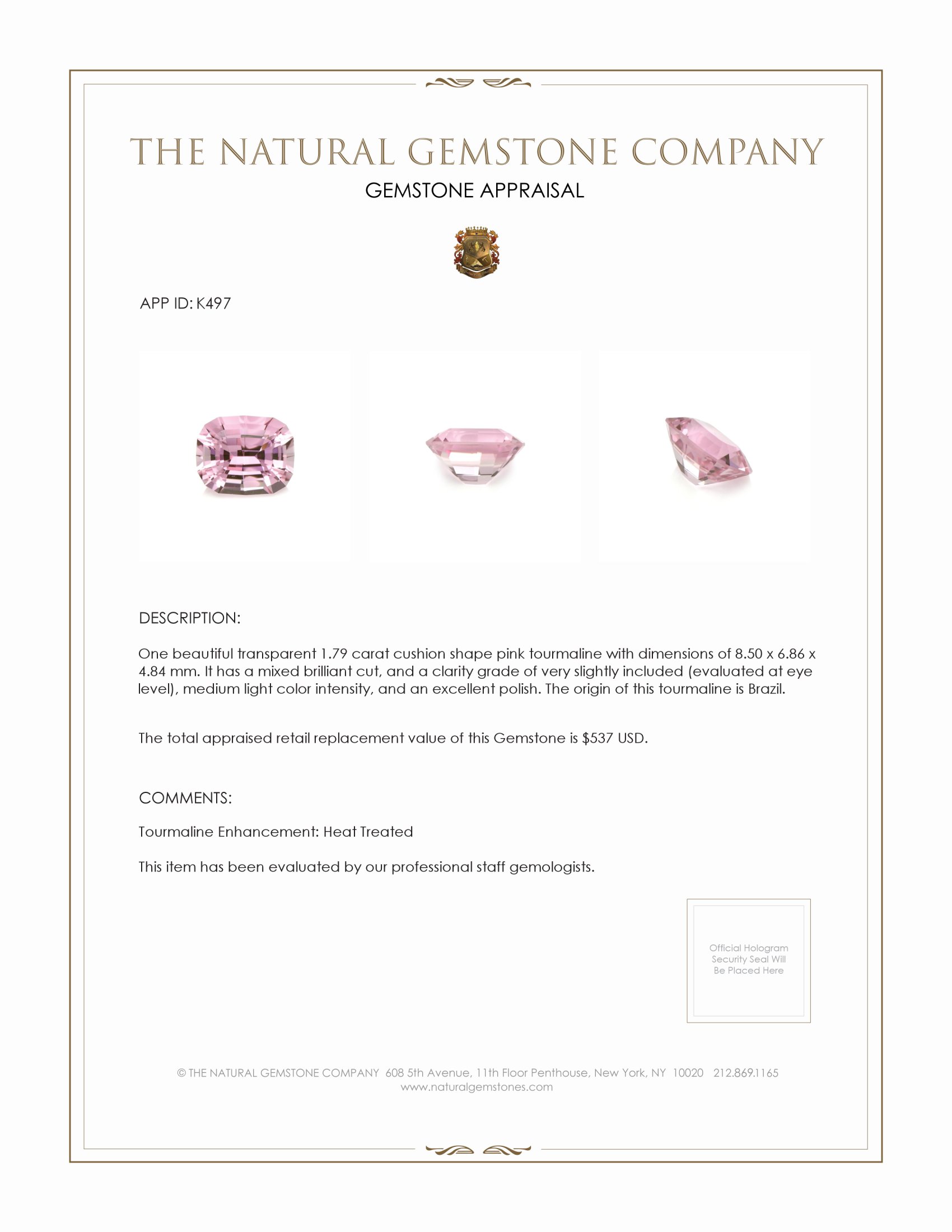 The ring features a beautiful, transparent 1.79 carat cushion shape pink tourmaline with the dimensions of 8.50 x 6.86 x 4.84 mm and a mixed brilliant cut. It has a clarity grade of very slightly included (evaluated at eye level), medium light color saturation, and an excellent polish. The origin of this tourmaline is Brazil.