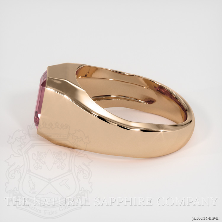 The men's ring features a beautiful, transparent 2.04 carat emerald cut shape pink tourmaline with the dimensions of 8.77 x 6.08 x 4.80 mm and a emerald cut. It has a clarity grade of very slightly included (evaluated at eye level), intense color saturation, and an excellent polish. The origin of this tourmaline is Mozambique.