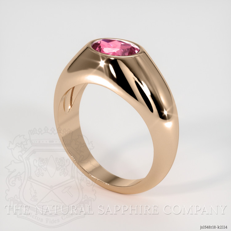 The men's ring features a beautiful, transparent 1.11 carat oval shape pink tourmaline with the dimensions of 7.71 x 5.83 x 3.78 mm and a mixed brilliant cut. It has a clarity grade of very slightly included (evaluated at eye level), intense color saturation, and an excellent polish. The origin of this tourmaline is Mozambique.