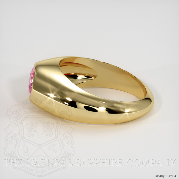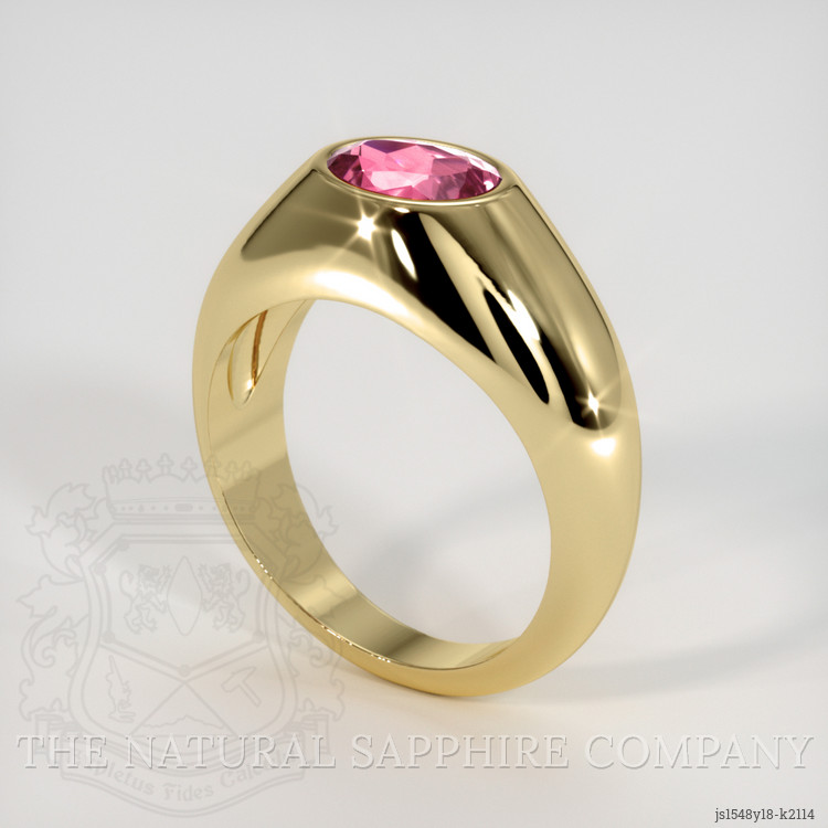 The men's ring features a beautiful, transparent 1.11 carat oval shape pink tourmaline with the dimensions of 7.71 x 5.83 x 3.78 mm and a mixed brilliant cut. It has a clarity grade of very slightly included (evaluated at eye level), intense color saturation, and an excellent polish. The origin of this tourmaline is Mozambique.