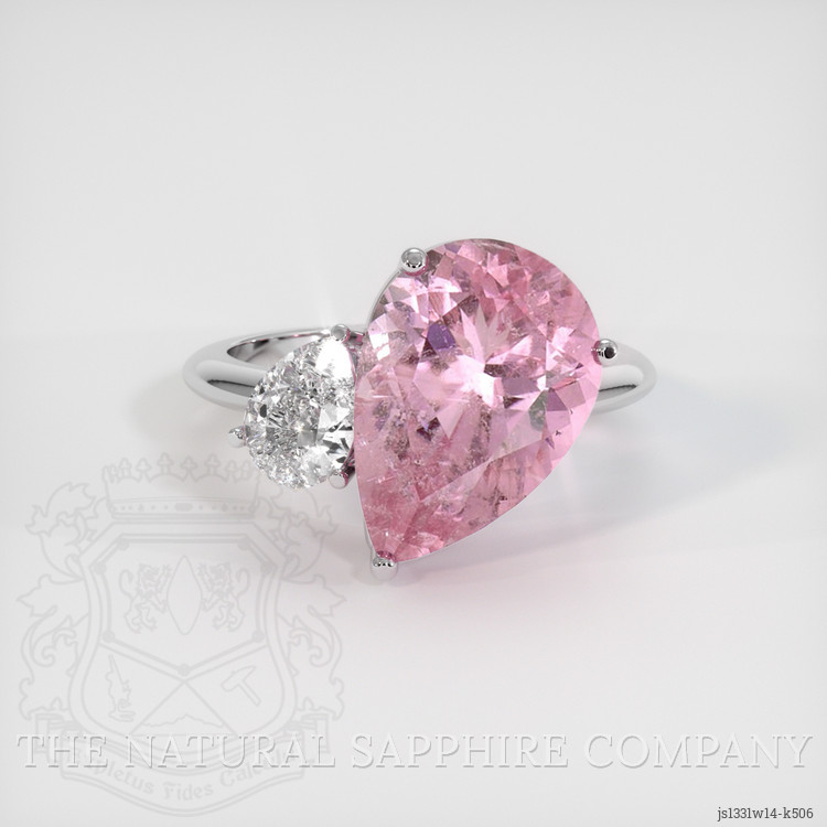 The ring features a beautiful, transparent 5.33 carat pear shape pink tourmaline with the dimensions of 14.38 x 9.87 x 6.73 mm and a mixed brilliant cut. It has a clarity grade of slightly included (evaluated at eye level), medium color saturation, and an excellent polish. The origin of this tourmaline is Mozambique.