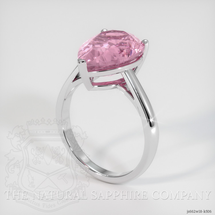The ring features a beautiful, transparent 5.33 carat pear shape pink tourmaline with the dimensions of 14.38 x 9.87 x 6.73 mm and a mixed brilliant cut. It has a clarity grade of slightly included (evaluated at eye level), medium color saturation, and an excellent polish. The origin of this tourmaline is Mozambique.