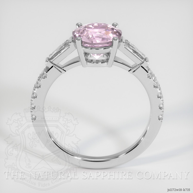 The ring features a beautiful, transparent 2.62 carat round shape pink tourmaline with the dimensions of 9.08 x 9.05 x 6.11 mm and a mixed brilliant cut. It has a clarity grade of eye clean (evaluated at eye level), light color saturation, and an excellent polish. The origin of this tourmaline is Nigeria.