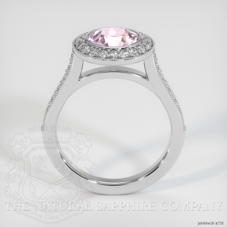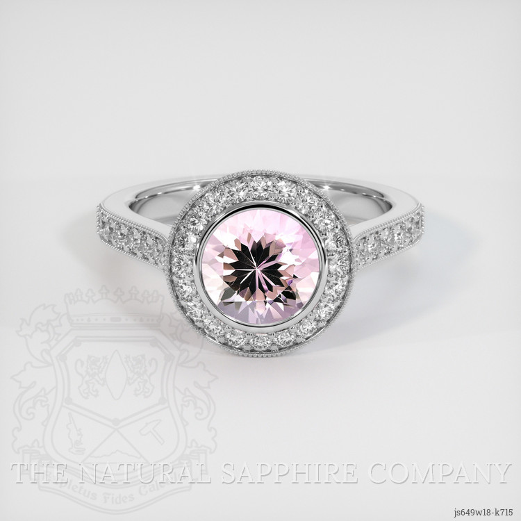 The ring features a beautiful, transparent 2.62 carat round shape pink tourmaline with the dimensions of 9.08 x 9.05 x 6.11 mm and a mixed brilliant cut. It has a clarity grade of eye clean (evaluated at eye level), light color saturation, and an excellent polish. The origin of this tourmaline is Nigeria.
